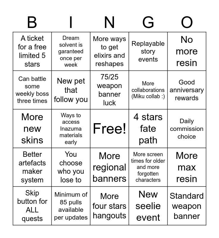 This bingo card has a free space and 24 words: You choose who you lose to, Minimum of 85 pulls available per updates, 75/25 weapon banner luck, Skip button for ALL quests, No more resin, A ticket for a free limited 5 stars, Can battle some weekly boss three times, Dream solvent is garanteed once per week, 4 stars fate path, More regional banners, More collaborations (Miku collab :), More new skins, More screen times for older and more forgotten characters, More max resin, New pet that follow you, New seelie event, Daily commission choice, More ways to get elixirs and reshapes, Good anniversary rewards, Ways to access Inazuma materials early, Standard weapon banner, Better artefacts maker system, Replayable story events and More four stars hangouts.