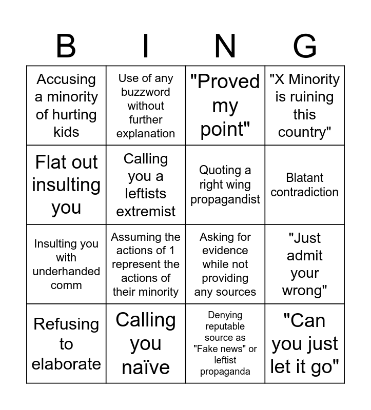 This bingo card has 16 words: Calling you naïve, "Just admit your wrong", "Proved my point", Accusing a minority of hurting kids, Insulting you with underhanded comm, Use of any buzzword without further explanation, Asking for evidence while not providing any sources, Denying reputable source as "Fake news" or leftist propaganda, Flat out insulting you, Calling you a leftists extremist, Refusing to elaborate, "X Minority is ruining this country", Assuming the actions of 1 represent the actions of their minority, Blatant contradiction, Quoting a right wing propagandist and "Can you just let it go".