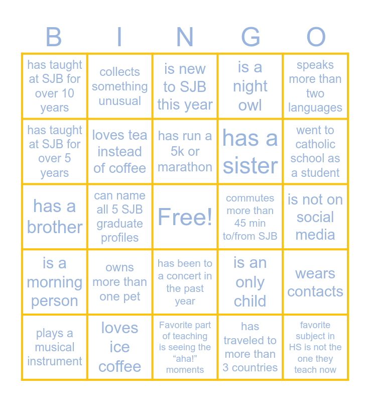This bingo card has a free space and 24 words: owns more than one pet, loves ice coffee, has run a 5k or marathon, plays a musical instrument, speaks more than two languages, has taught at SJB for over 10 years, has taught at SJB for over 5 years, collects something unusual, commutes more than 45 min to/from SJB, has been to a concert in the past year, has a sister, has a brother, is an only child, wears contacts, loves tea instead of coffee, has traveled to more than 3 countries, is not on social media, is new to SJB this year, went to catholic school as a student, can name all 5 SJB graduate profiles, favorite subject in HS is not the one they teach now, is a morning person, is a night owl and Favorite part of teaching is seeing the “aha!” moments.