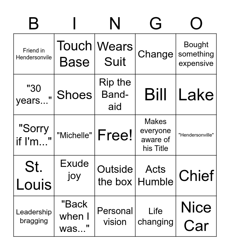 This bingo card has a free space and 24 words: Exude joy, "Back when I was...", Rip the Band-aid, Leadership bragging, Bought something expensive, Friend in Hendersonvile, "30 years...", Touch Base, Makes everyone aware of his Title, Outside the box, Bill, "Sorry if I'm...", Acts Humble, Chief, Shoes, Life changing, "Hendersonville", Wears Suit, Lake, "Michelle", Nice Car, St. Louis, Change and Personal vision.