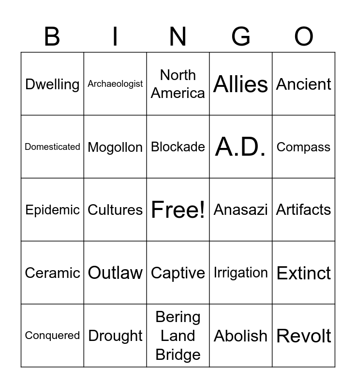 This bingo card has a free space and 32 words: Abolish, Adobe, Cultures, Climate, Ceramic, Mogollon, Ancient, Extinct, Archaeologist, Basket Makers, Blockade, North America, Mesas, Expedition, Anasazi, Descendants, Conquered, Epidemic, Captive, Outlaw, Irrigation, Ceremonies, Artifacts, Drought, Revolt, Allies, A.D., Domesticated, Dwelling, Bering Land Bridge, Pueblo and Compass.