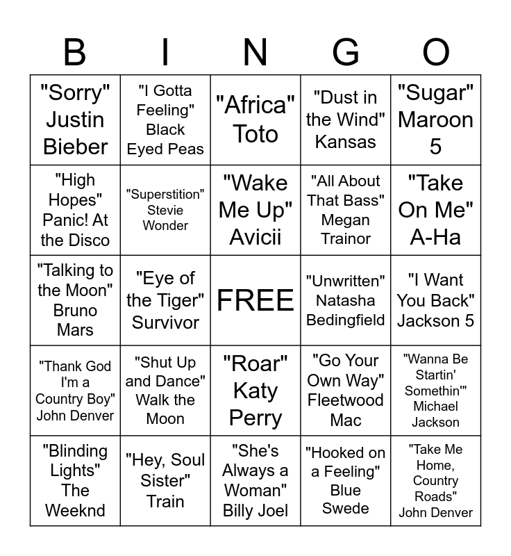 This bingo card has a free space and 24 words: "Shut Up and Dance" Walk the Moon, "Hey, Soul Sister" Train, "Wake Me Up" Avicii, "Blinding Lights" The Weeknd, "Sugar" Maroon 5, "Sorry" Justin Bieber, "High Hopes" Panic! At the Disco, "I Gotta Feeling" Black Eyed Peas, "Unwritten" Natasha Bedingfield, "Roar" Katy Perry, "All About That Bass" Megan Trainor, "Talking to the Moon" Bruno Mars, "Go Your Own Way" Fleetwood Mac, "Wanna Be Startin' Somethin'" Michael Jackson, "Superstition" Stevie Wonder, "Hooked on a Feeling" Blue Swede, "I Want You Back" Jackson 5, "Africa" Toto, "Take On Me" A-Ha, "Eye of the Tiger" Survivor, "Take Me Home, Country Roads" John Denver, "Thank God I'm a Country Boy" John Denver, "Dust in the Wind" Kansas and "She's Always a Woman" Billy Joel.