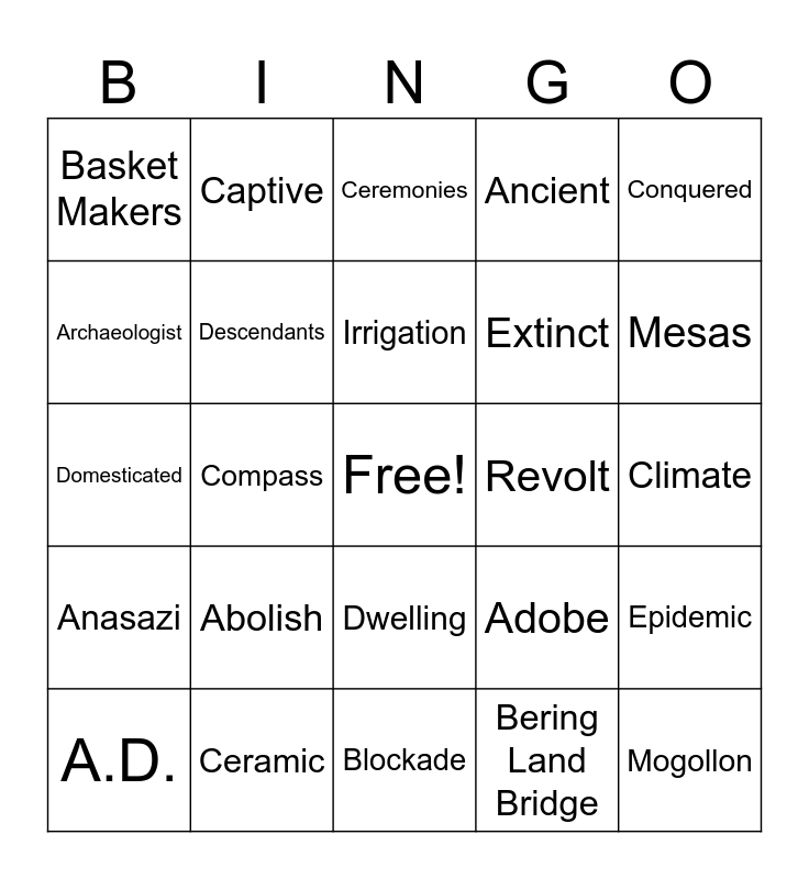 This bingo card has a free space and 32 words: Bering Land Bridge, Pueblo, Compass, Expedition, Anasazi, Descendants, Conquered, Epidemic, Captive, Outlaw, Irrigation, Ceremonies, Artifacts, Drought, Revolt, Allies, A.D., Domesticated, Dwelling, Abolish, Adobe, Cultures, Climate, Ceramic, Mogollon, Ancient, Extinct, Archaeologist, Basket Makers, Blockade, North America and Mesas.
