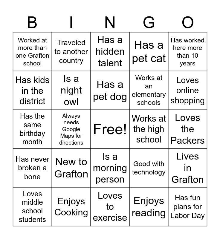 This bingo card has a free space and 24 words: New to Grafton, Enjoys Cooking, Has a pet dog, Loves middle school students, Has worked here more than 10 years, Worked at more than one Grafton school, Has kids in the district, Traveled to another country, Works at the high school, Is a morning person, Works at an elementary schools, Has the same birthday month, Good with technology, Lives in Grafton, Is a night owl, Enjoys reading, Loves the Packers, Has a hidden talent, Loves online shopping, Always needs Google Maps for directions, Has fun plans for Labor Day, Has never broken a bone, Has a pet cat and Loves to exercise.