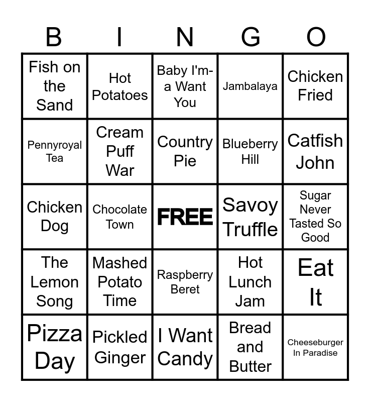 This bingo card has a free space and 44 words: Cherry Pie, Cheeseburger In Paradise, Hot Dog, Pizza Day, Puttin' on the Ritz, Bread and Butter, Baby I'm-a Want You, Coconut, Chicken Fried, Pickled Ginger, Jambalaya, Savoy Truffle, Raspberry Beret, Mashed Potato Time, Sugar, I Want Candy, Cherry Oh Baby, Chicken Dog, Vegetables, Catfish John, Hot Potatoes, Pork And Beans, My Boy Lollipop, Fish on the Sand, Pour Some Sugar On Me, Sugar Never Tasted So Good, Ice Cream Man, Green Onions, Hot Lunch Jam, The Lemon Song, Guava Jelly, Eat It, Black Coffee In Bed, Shamalamma Ding Dong, Chocolate Town, Burrito, Eat Steak, Orange Crush, Country Pie, Pennyroyal Tea, Blueberry Hill, Pretzel Logic, Cream Puff War and She Don't Use Jelly.