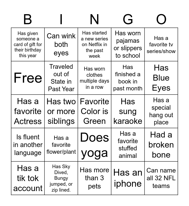 This bingo card has 60 words: Owns a car, Has Sky Dived, Bungy jumped, or zip lined., Has a favorite ice cream topping, Is fluent in another language, Has an iphone, Has run a race or triathlon, Traveled out of State in Past Year, Has a healthy habit, Has finished a book in past month, Has a favorite Disney movie, Has worn pajamas or slippers to school, Plays a different sport each season, Free, Plays or has played an Instrument, Has a favorite activity they do with their family, Has given someone a card of gift for their birthday this year, Favorite Color is Green, Has a favorite tv series/show, Has signature dance move, Has worn clothes multiple days in a row, Has sung karaoke, Has started a new series on Netflix in the past week, Has a tik tok account, Had a broken bone, Likes Raw Oysters, Has a favorite beach, Has gone camping, Has a family member who served in the armed forces, Has Blue Eyes, Has been in a movie, Has met a celebrity, Has a family pet, Has an annual family vacation, Has a favorite meal/food to cook, Can wink both eyes, Birthday month starts with letter "J", Has a favorite song to sing, Has two or more siblings, Has a favorite Actor, Has a favorite Actress, Has a membership to fitness club, Has a favorite flower/plant, Has a special hang out place, Has a unique talent, Has a favorite stuffed animal, Has a hobby, Downloaded New App in Past Month, Has a family member overseas, Knows how to skateboard, Does yoga, Has more than 3 pets, Has an unusual pet, Lives on more than 3 acres, Has been on a cruise, Is ambidextrous, Is color blind, Can tap dance, Can name all 7 dwarfs (from Snow White), Can name all 32 NFL teams and Has Painted Toe Nails.