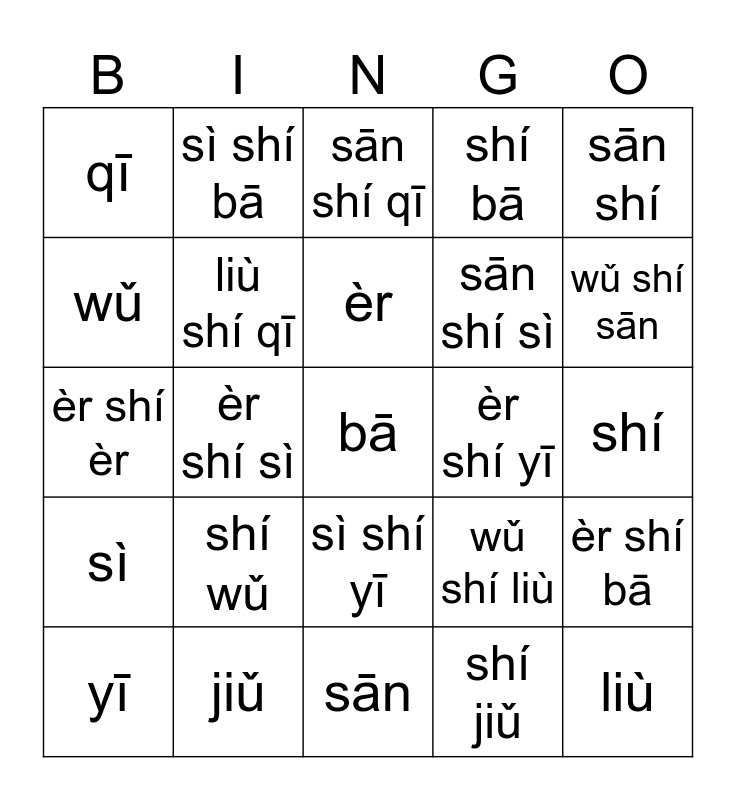 This bingo card has a free space and 24 words: shí wǔ, jiǔ, èr, yī, sān shí, qī, wǔ, sì shí bā, èr shí yī, sì shí yī, sān shí sì, èr shí èr, wǔ shí liù, èr shí bā, liù shí qī, shí jiǔ, shí, sān shí qī, wǔ shí sān, èr shí sì, liù, sì, shí bā and sān.