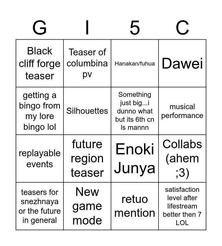 This bingo card has 16 words: New game mode, Collabs (ahem ;3), Hanakan/fuhua, Black cliff forge teaser, replayable events, Teaser of columbina pv, Enoki Junya, retuo mention, getting a bingo from my lore bingo lol, Silhouettes, teasers for snezhnaya or the future in general, Dawei, future region teaser, musical performance, Something just big...i dunno what but its 6th cn ls mannn and satisfaction level after lifestream better then 7 LOL.