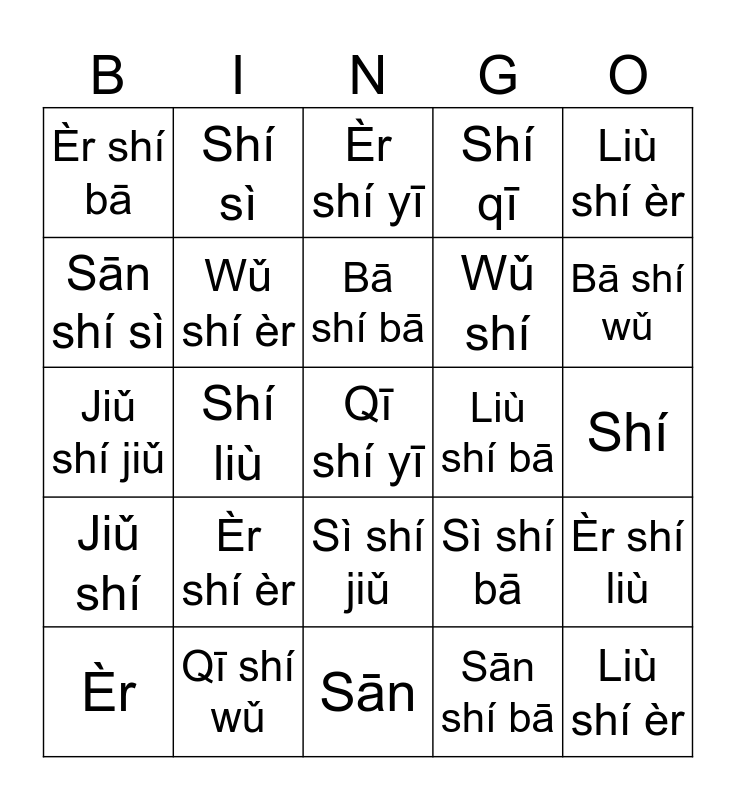 This bingo card has a free space and 24 words: Èr shí èr, Qī shí wǔ, Bā shí bā, Èr, Liù shí èr, Èr shí bā, Sān shí sì, Shí sì, Liù shí bā, Sì shí jiǔ, Wǔ shí, Jiǔ shí jiǔ, Sì shí bā, Èr shí liù, Wǔ shí èr, Sān shí bā, Shí, Èr shí yī, Bā shí wǔ, Shí liù, Liù shí èr, Jiǔ shí, Shí qī and Sān.