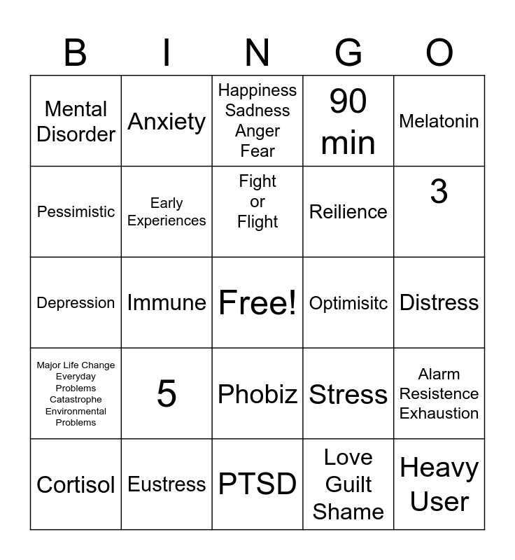 This bingo card has a free space and 24 words: 5, Eustress, Fight or Flight, Cortisol, Melatonin, Mental Disorder, Pessimistic, Anxiety, Optimisitc, Phobiz, Reilience, Depression, Stress, Alarm Resistence Exhaustion, Early Experiences, Love Guilt Shame, Distress, Happiness Sadness Anger Fear, 3, Immune, Heavy User, Major Life Change Everyday Problems Catastrophe Environmental Problems, 90 min and PTSD.