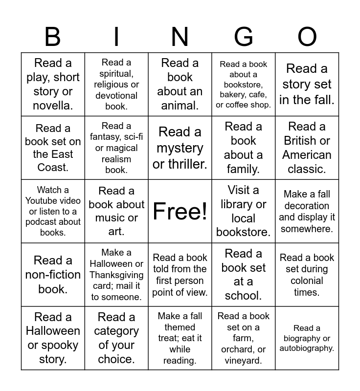 This bingo card has a free space and 24 words: Make a Halloween or Thanksgiving card; mail it to someone., Read a category of your choice., Read a mystery or thriller., Read a Halloween or spooky story., Read a story set in the fall., Read a play, short story or novella., Read a book set on the East Coast., Read a spiritual, religious or devotional book., Visit a library or local bookstore., Read a book told from the first person point of view., Read a book about a family., Watch a Youtube video or listen to a podcast about books., Read a book set at a school., Read a book set during colonial times., Read a fantasy, sci-fi or magical realism book., Read a book set on a farm, orchard, or vineyard., Make a fall decoration and display it somewhere., Read a book about an animal., Read a British or American classic., Read a book about music or art., Read a biography or autobiography., Read a non-fiction book., Read a book about a bookstore, bakery, cafe, or coffee shop. and Make a fall themed treat; eat it while reading..