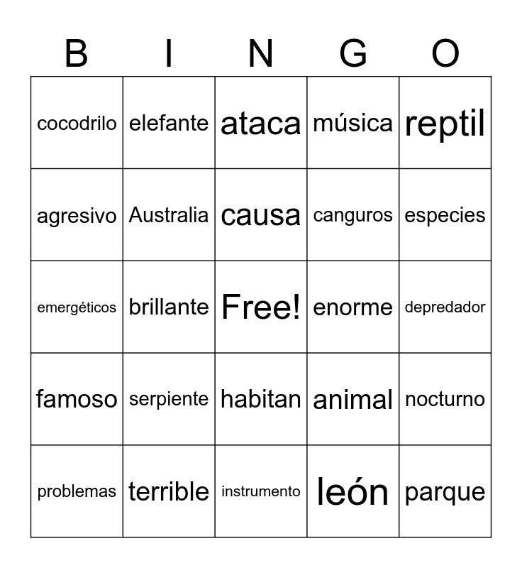 This bingo card has a free space and 24 words: serpiente, terrible, causa, problemas, reptil, cocodrilo, agresivo, elefante, enorme, habitan, canguros, emergéticos, animal, nocturno, Australia, león, depredador, ataca, especies, brillante, parque, famoso, música and instrumento.