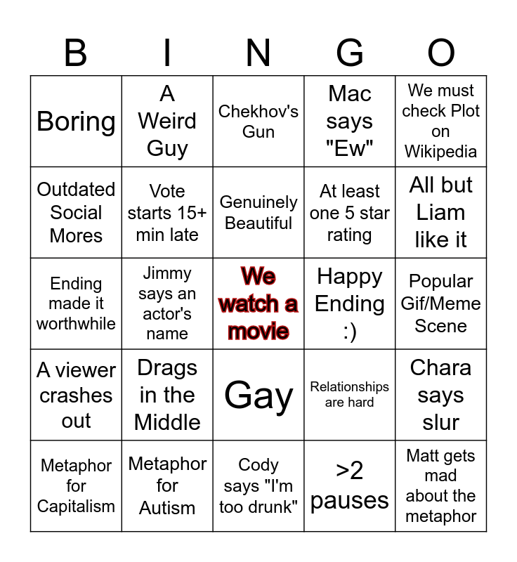 This bingo card has a free space and 24 words: Drags in the Middle, Metaphor for Autism, Genuinely Beautiful, Metaphor for Capitalism, We must check Plot on Wikipedia, Boring, Outdated Social Mores, A Weird Guy, Happy Ending :), Gay, At least one 5 star rating, Ending made it worthwhile, Relationships are hard, Chara says slur, Vote starts 15+ min late, >2 pauses, Popular Gif/Meme Scene, Chekhov's Gun, All but Liam like it, Jimmy says an actor's name, Matt gets mad about the metaphor, A viewer crashes out, Mac says "Ew" and Cody says "I'm too drunk".