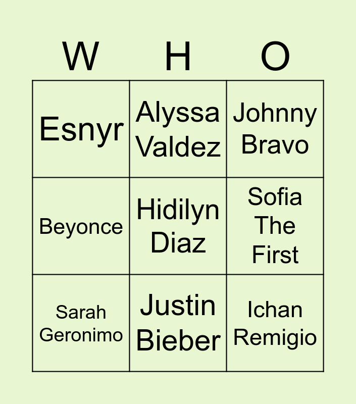This bingo card has 15 words: Jose Rizal, Justin Bieber, Johnny Bravo, Esnyr, Hidilyn Diaz, Ichan Remigio, Fyang, Lea Salonga, Taylor Swift, Sarah Geronimo, Dwayne Johnson, Sofia The First, Beyonce, Alyssa Valdez and Carlos Yulo.