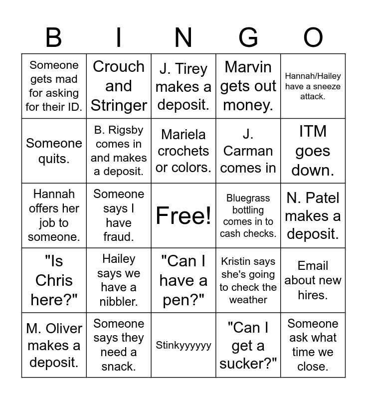 This bingo card has a free space and 24 words: M. Oliver makes a deposit., Hailey says we have a nibbler., Mariela crochets or colors., "Can I get a sucker?", Hannah/Hailey have a sneeze attack., Someone gets mad for asking for their ID., Crouch and Stringer, J. Tirey makes a deposit., Bluegrass bottling comes in to cash checks., N. Patel makes a deposit., Hannah offers her job to someone., B. Rigsby comes in and makes a deposit., Kristin says she's going to check the weather, Email about new hires., Someone quits., Someone says they need a snack., Stinkyyyyyy, Marvin gets out money., ITM goes down., "Is Chris here?", Someone says I have fraud., "Can I have a pen?", J. Carman comes in and Someone ask what time we close..