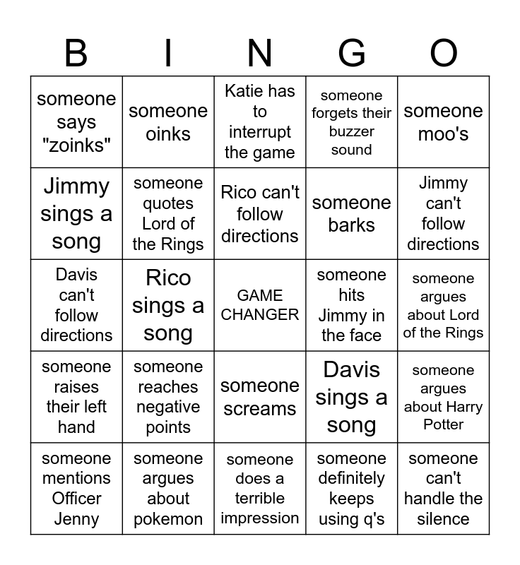 This bingo card has a free space and 24 words: someone reaches negative points, someone argues about pokemon, Rico can't follow directions, someone mentions Officer Jenny, someone moo's, someone says "zoinks", Jimmy sings a song, someone oinks, someone hits Jimmy in the face, someone screams, someone barks, Davis can't follow directions, Davis sings a song, someone argues about Harry Potter, someone quotes Lord of the Rings, someone definitely keeps using q's, someone argues about Lord of the Rings, Katie has to interrupt the game, Jimmy can't follow directions, Rico sings a song, someone can't handle the silence, someone raises their left hand, someone forgets their buzzer sound and someone does a terrible impression.