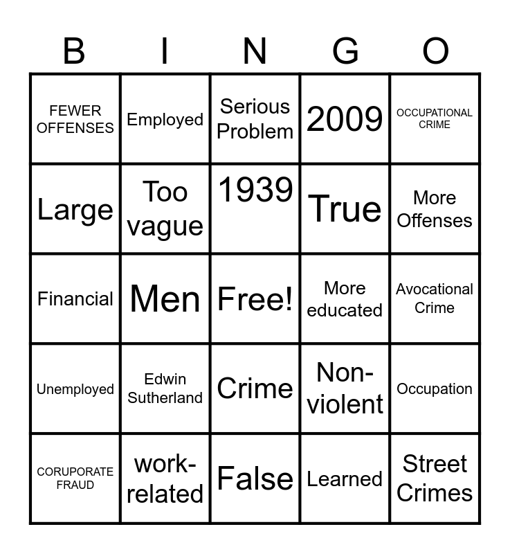 This bingo card has a free space and 24 words: Edwin Sutherland, work-related, 1939, CORUPORATE FRAUD, OCCUPATIONAL CRIME, FEWER OFFENSES, Large, Employed, More educated, Crime, True, Financial, Non-violent, Occupation, Too vague, Learned, Avocational Crime, Serious Problem, More Offenses, Men, Street Crimes, Unemployed, 2009 and False.