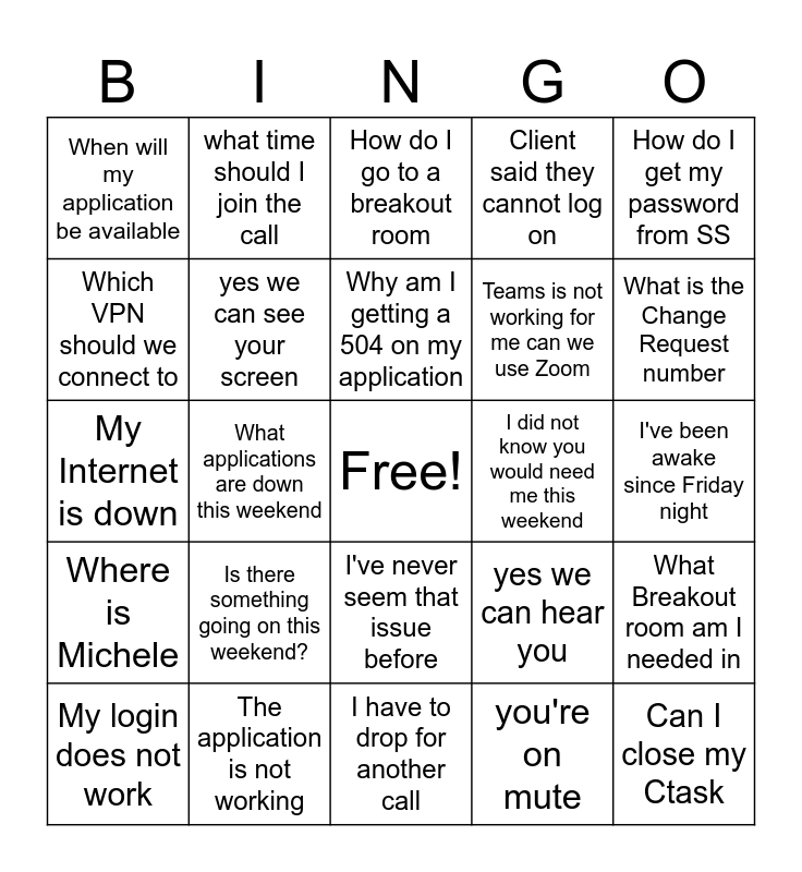 This bingo card has a free space and 24 words: Is there something going on this weekend?, The application is not working, Why am I getting a 504 on my application, My login does not work, How do I get my password from SS, When will my application be available, Which VPN should we connect to, what time should I join the call, I did not know you would need me this weekend, I've never seem that issue before, Teams is not working for me can we use Zoom, My Internet is down, yes we can hear you, What Breakout room am I needed in, yes we can see your screen, you're on mute, I've been awake since Friday night, How do I go to a breakout room, What is the Change Request number, What applications are down this weekend, Can I close my Ctask, Where is Michele, Client said they cannot log on and I have to drop for another call.