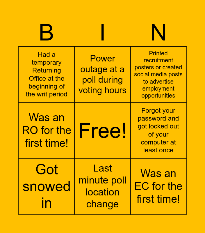 This bingo card has a free space and 14 words: Delivered a general election (already marked centre x), Handled returned VICs from Canada Post, Got snowed in, Power outage at a poll during voting hours, Was an RO for the first time!, Was an EC for the first time!, Had a candidate drop out, Tabulator or e-poll book stopped working at poll, Last minute poll location change, Had a temporary Returning Office at the beginning of the writ period, Pulled an all-nighter (or close to it), Forgot your password and got locked out of your computer at least once, Printed recruitment posters or created social media posts to advertise employment opportunities and Had to request additional printer cartridges.