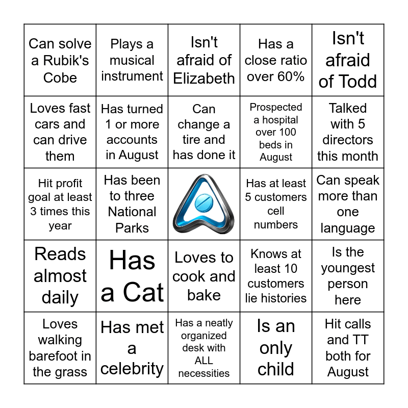 This bingo card has a free space and 24 words: Has a Cat, Has met a celebrity, Can change a tire and has done it, Loves walking barefoot in the grass, Isn't afraid of Todd, Can solve a Rubik's Cobe, Loves fast cars and can drive them, Plays a musical instrument, Has at least 5 customers cell numbers, Loves to cook and bake, Prospected a hospital over 100 beds in August, Hit profit goal at least 3 times this year, Knows at least 10 customers lie histories, Is the youngest person here, Has turned 1 or more accounts in August, Is an only child, Can speak more than one language, Isn't afraid of Elizabeth, Talked with 5 directors this month, Has been to three National Parks, Hit calls and TT both for August, Reads almost daily, Has a close ratio over 60% and Has a neatly organized desk with ALL necessities.