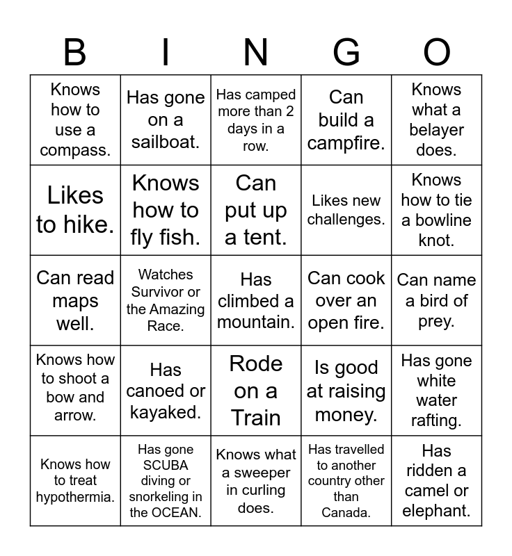 This bingo card has 25 words: Has canoed or kayaked., Knows what a sweeper in curling does., Can put up a tent., Knows how to treat hypothermia., Knows what a belayer does., Knows how to use a compass., Likes to hike., Has gone on a sailboat., Can cook over an open fire., Rode on a Train, Likes new challenges., Can read maps well., Is good at raising money., Has gone white water rafting., Knows how to fly fish., Has ridden a camel or elephant., Can name a bird of prey., Has camped more than 2 days in a row., Knows how to tie a bowline knot., Watches Survivor or the Amazing Race., Has climbed a mountain., Has gone SCUBA diving or snorkeling in the OCEAN., Knows how to shoot a bow and arrow., Can build a campfire. and Has travelled to another country other than Canada..