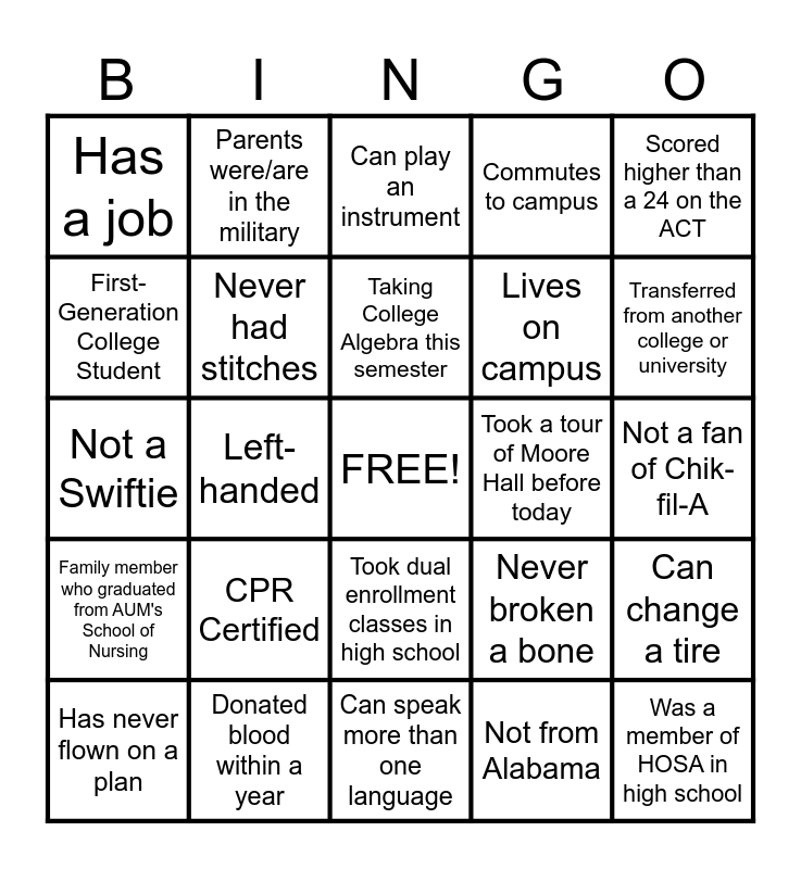 This bingo card has a free space and 24 words: CPR Certified, Donated blood within a year, Taking College Algebra this semester, Has never flown on a plan, Scored higher than a 24 on the ACT, Has a job, First-Generation College Student, Parents were/are in the military, Took a tour of Moore Hall before today, Took dual enrollment classes in high school, Lives on campus, Not a Swiftie, Never broken a bone, Can change a tire, Never had stitches, Not from Alabama, Not a fan of Chik-fil-A, Can play an instrument, Transferred from another college or university, Left-handed, Was a member of HOSA in high school, Family member who graduated from AUM's School of Nursing, Commutes to campus and Can speak more than one language.