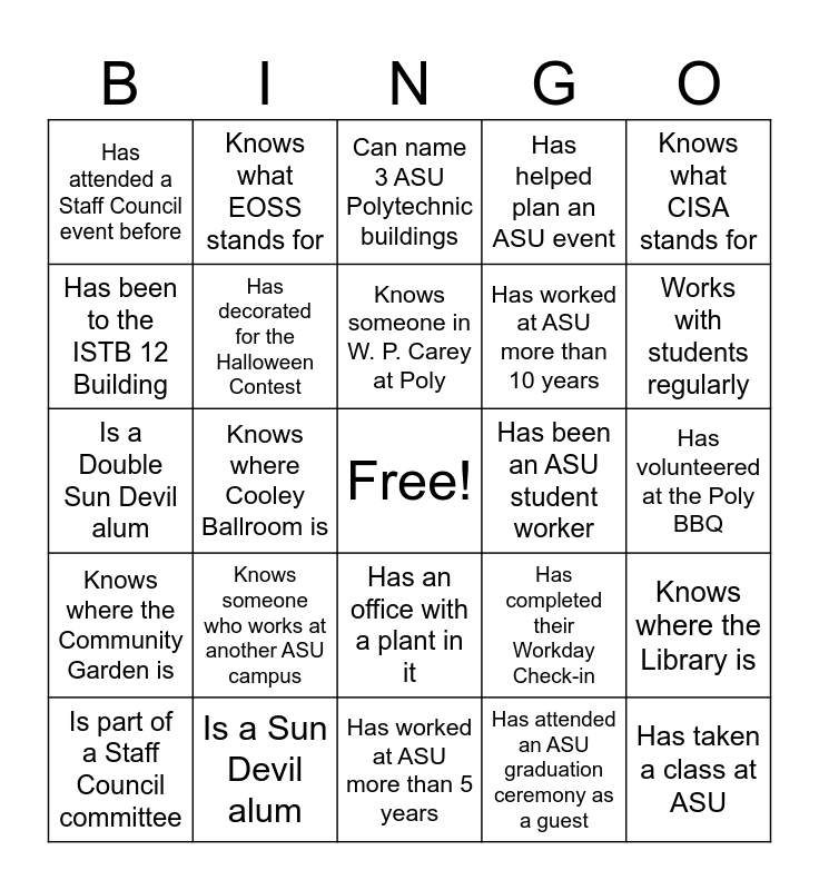 This bingo card has a free space and 24 words: Knows someone who works at another ASU campus, Is a Sun Devil alum, Knows someone in W. P. Carey at Poly, Is part of a Staff Council committee, Knows what CISA stands for, Has attended a Staff Council event before, Has been to the ISTB 12 Building, Knows what EOSS stands for, Has been an ASU student worker, Has an office with a plant in it, Has worked at ASU more than 10 years, Is a Double Sun Devil alum, Has completed their Workday Check-in, Knows where the Library is, Has decorated for the Halloween Contest, Has attended an ASU graduation ceremony as a guest, Has volunteered at the Poly BBQ, Can name 3 ASU Polytechnic buildings, Works with students regularly, Knows where Cooley Ballroom is, Has taken a class at ASU, Knows where the Community Garden is, Has helped plan an ASU event and Has worked at ASU more than 5 years.