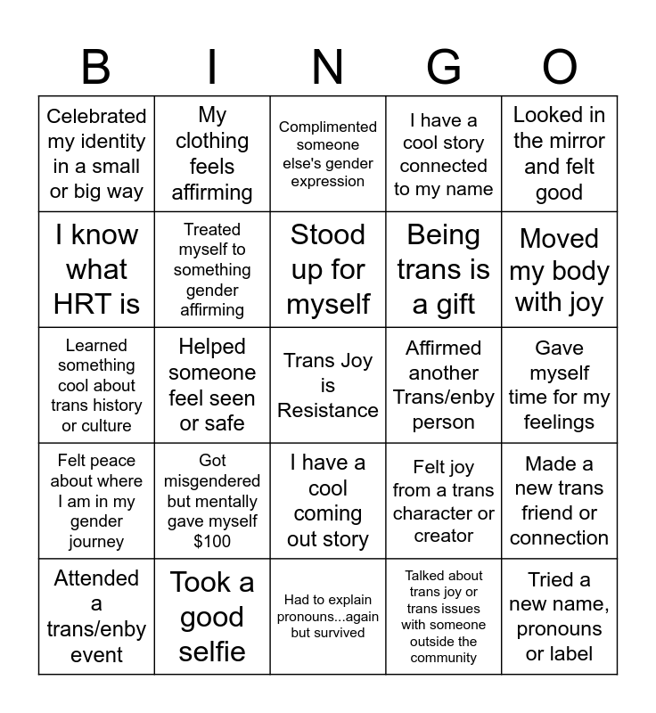 This bingo card has a free space and 29 words: Wore an outfit that made me feel amazing, Took a good selfie, Complimented someone else's gender expression, Someone used the right name/pronouns without being prompted, Looked in the mirror and felt good, Celebrated my identity in a small or big way, Treated myself to something gender affirming, Stood up for myself, Affirmed another Trans/enby person, Made a new trans friend or connection, Attended a trans/enby event, Helped someone feel seen or safe, Talked about trans joy or trans issues with someone outside the community, Tried a new name, pronouns or label, Learned something cool about trans history or culture, Played with my gender expression, Had to explain pronouns...again but survived, Felt joy from a trans character or creator, Moved my body with joy, Felt peace about where I am in my gender journey, Got misgendered but mentally gave myself $100, Gender? Completed it., Being trans is a gift, Gave myself time for my feelings, I know what HRT is, My clothing feels affirming, I have a cool coming out story, I have a cool story connected to my name and I know that we will persevere.