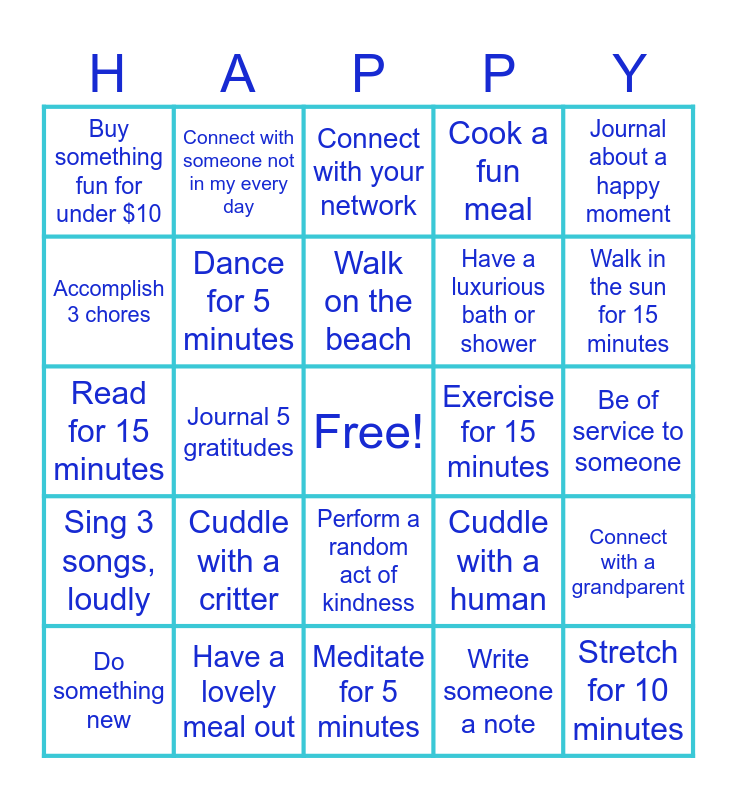 This bingo card has a free space and 24 words: Cuddle with a critter, Have a lovely meal out, Walk on the beach, Do something new, Journal about a happy moment, Buy something fun for under $10, Accomplish 3 chores, Connect with someone not in my every day, Exercise for 15 minutes, Perform a random act of kindness, Have a luxurious bath or shower, Read for 15 minutes, Cuddle with a human, Connect with a grandparent, Dance for 5 minutes, Write someone a note, Be of service to someone, Connect with your network, Walk in the sun for 15 minutes, Journal 5 gratitudes, Stretch for 10 minutes, Sing 3 songs, loudly, Cook a fun meal and Meditate for 5 minutes.