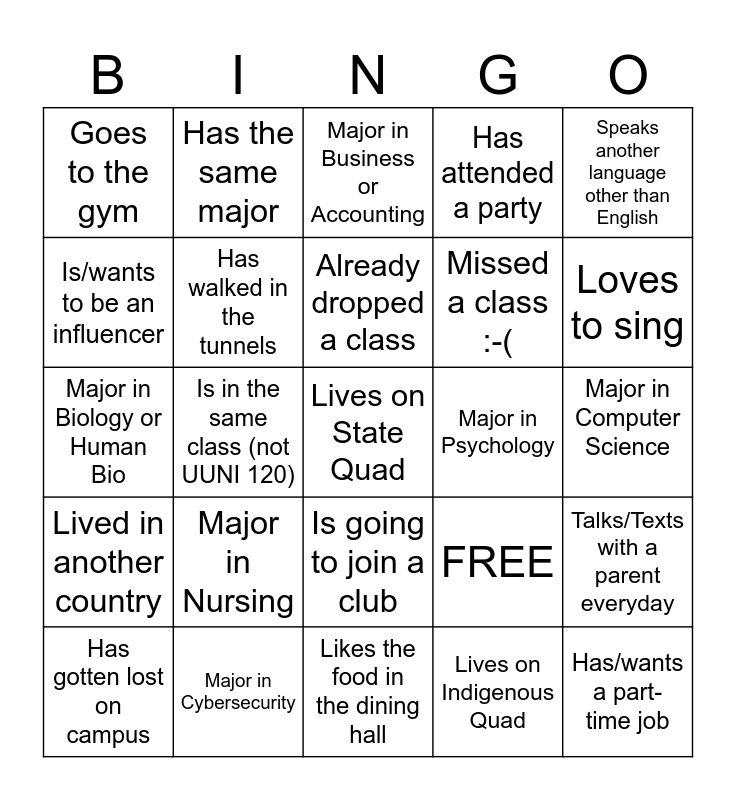 This bingo card has 25 words: Major in Nursing, Likes the food in the dining hall, Already dropped a class, Has gotten lost on campus, Speaks another language other than English, Goes to the gym, Is/wants to be an influencer, Has the same major, Major in Psychology, Is going to join a club, Missed a class :-(, Major in Biology or Human Bio, FREE, Talks/Texts with a parent everyday, Has walked in the tunnels, Has/wants a part-time job, Major in Computer Science, Major in Business or Accounting, Loves to sing, Is in the same class (not UUNI 120), Lives on State Quad, Major in Cybersecurity, Lived in another country, Has attended a party and Lives on Indigenous Quad.