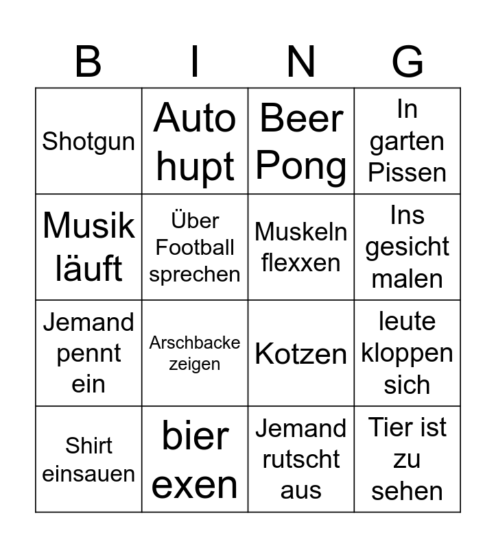 This bingo card has 16 words: bier exen, leute kloppen sich, Beer Pong, Shotgun, Jemand pennt ein, Auto hupt, Kotzen, Jemand rutscht aus, Musik läuft, Über Football sprechen, Shirt einsauen, In garten Pissen, Arschbacke zeigen, Ins gesicht malen, Muskeln flexxen and Tier ist zu sehen.