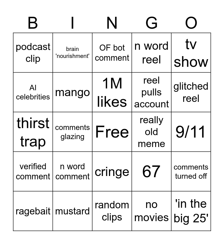 This bingo card has a free space and 24 words: n word comment, mustard, 1M likes, ragebait, tv show, podcast clip, AI celebrities, brain 'nourishment', really old meme, cringe, reel pulls account, thirst trap, 67, comments turned off, mango, no movies, 9/11, OF bot comment, glitched reel, comments glazing, 'in the big 25', verified comment, n word reel and random clips.