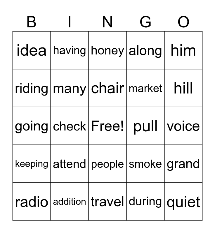 This bingo card has a free space and 29 words: radio, heavy, check, sweet, idea, honey, many, attend, pull, addition, voice, quiet, travel, during, hill, plant, people, keeping, him, going, smoke, small, market, riding, along, having, grand, chair and model.