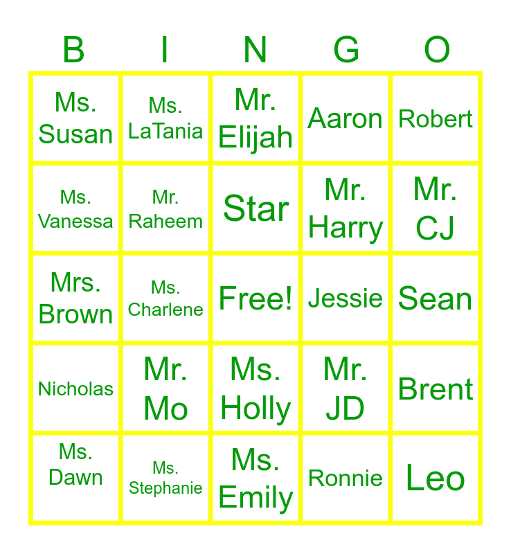 This bingo card has a free space and 29 words: Ms. Dawn, Mr. G, Ms. Charlene, Ms. Janice, Ms. Susan, Mr. Elijah, Mr. Raheem, Mr. Mo, Jessie, Ms. Stephanie, Sean, Leo, Ms. Emily, Ronnie, Mr. CJ, Isaiah, Ms. Holly, Nicholas, Robert, Mrs. Brown, Mr. JD, Mr. Buck, Mr. Harry, Ms. Vanessa, Aaron, Ms. LaTania, Brent, Star and Daniel.