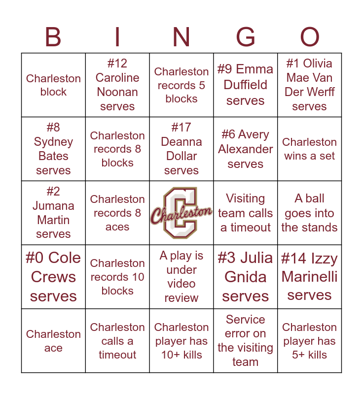 This bingo card has a free space and 29 words: Charleston ace, Charleston records 5 aces, Charleston records 8 aces, Charleston records 10 aces, Charleston block, Charleston records 5 blocks, Charleston records 8 blocks, Charleston records 10 blocks, Visiting team calls a timeout, Charleston calls a timeout, A ball goes into the stands, Charleston player has 5+ kills, Charleston player has 10+ kills, Service error on the visiting team, Charleston wins a set, Charleston wins two sets in a row, A play is under video review, #0 Cole Crews serves, #1 Olivia Mae Van Der Werff serves, #2 Jumana Martin serves, #3 Julia Gnida serves, #5 Lauren Dow serves, #6 Avery Alexander serves, #8 Sydney Bates serves, #9 Emma Duffield serves, #12 Caroline Noonan serves, #14 Izzy Marinelli serves, #17 Deanna Dollar serves and #21 Lainee Mack serves.