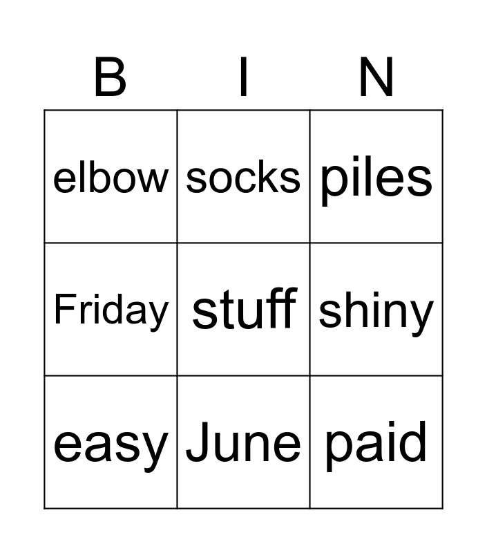 This bingo card has 14 words: math, toast, easy, socks, Friday, stuff, paid, cheese, June, elbow, program, shiny, piles and sticky.