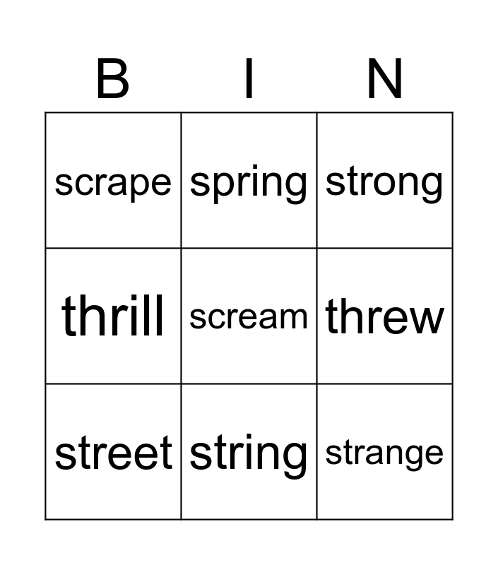 This bingo card has 14 words: three, scrap, street, spring, thrill, scream, strange, throw, string, scrape, spray, threw, strong and scratch.