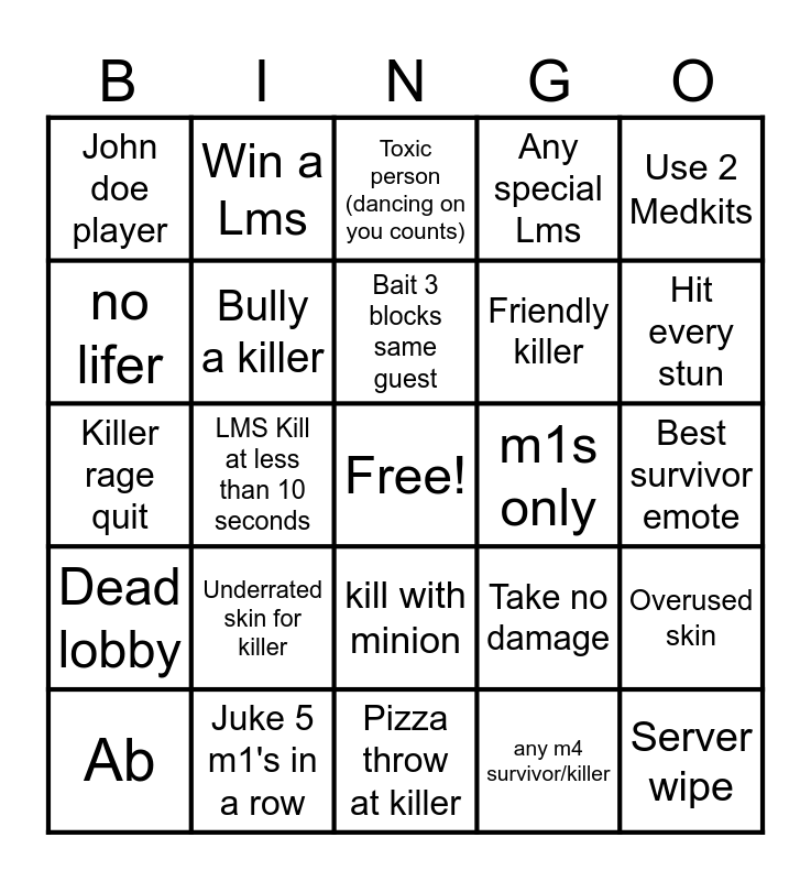This bingo card has a free space and 24 words: Underrated skin for killer, Juke 5 m1's in a row, Bait 3 blocks same guest, Ab, Use 2 Medkits, John doe player, no lifer, Win a Lms, m1s only, kill with minion, Friendly killer, Killer rage quit, Take no damage, Overused skin, Bully a killer, any m4 survivor/killer, Best survivor emote, Toxic person (dancing on you counts), Hit every stun, LMS Kill at less than 10 seconds, Server wipe, Dead lobby, Any special Lms and Pizza throw at killer.
