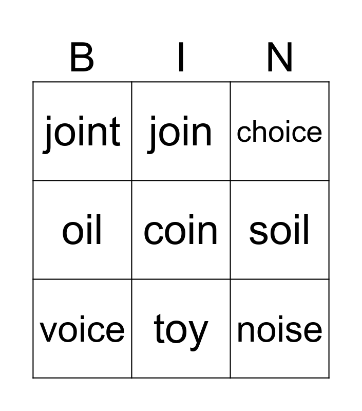 This bingo card has 14 words: joy, point, voice, join, oil, coin, noise, spoil, toy, joint, boy, soil, choice and boil.