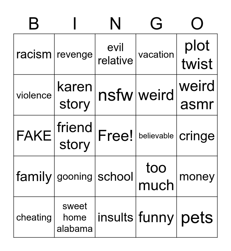 This bingo card has a free space and 24 words: gooning, sweet home alabama, nsfw, cheating, plot twist, racism, violence, revenge, believable, school, weird, FAKE, too much, money, karen story, funny, cringe, evil relative, weird asmr, friend story, pets, family, vacation and insults.