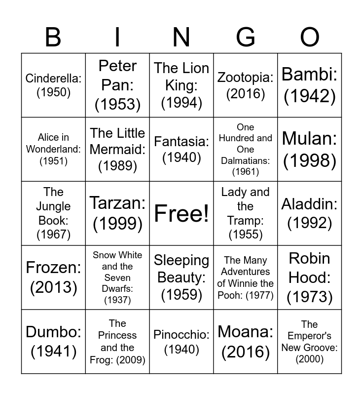 This bingo card has a free space and 25 words: Snow White and the Seven Dwarfs: (1937), Pinocchio: (1940), Fantasia: (1940), Dumbo: (1941), Bambi: (1942), Cinderella: (1950), Alice in Wonderland: (1951), Peter Pan: (1953), Lady and the Tramp: (1955), Sleeping Beauty: (1959), One Hundred and One Dalmatians: (1961), The Jungle Book: (1967), The Many Adventures of Winnie the Pooh: (1977), Robin Hood: (1973), The Little Mermaid: (1989), Beauty and the Beast: (1991), Aladdin: (1992), The Lion King: (1994), Mulan: (1998), Tarzan: (1999), The Emperor's New Groove: (2000), The Princess and the Frog: (2009), Frozen: (2013), Zootopia: (2016) and Moana: (2016).