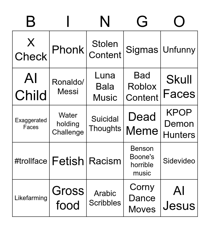This bingo card has a free space and 35 words: Green Screen, AI Cat, Cuck Fetish, Ronaldo/ Messi, Racism, Sigmas, AI Child, Selling a shitty product, Luna Bala Music, Asian Slums, Exaggerated Faces, Unfunny, Saturation, Fake content, X Check, Dead Meme, Corny Dance Moves, Water holding Challenge, #trollface, AI Jesus, Benson Boone's horrible music, Likefarming, Sidevideo, Gross food, Stolen Content, Skull Faces, One sound effect per second, Vine Boom, Bad Roblox Content, KPOP Demon Hunters, Don't Check the sound, Arabic Scribbles, Fetish, Phonk and Italian Brainrot.