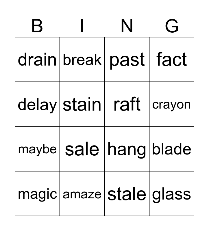 This bingo card has 20 words: blade, gray, past, afraid, magic, delay, amaze, drain, maybe, break, sale, hang, stain, glass, raft, jail, crayon, fact, stale and steak.