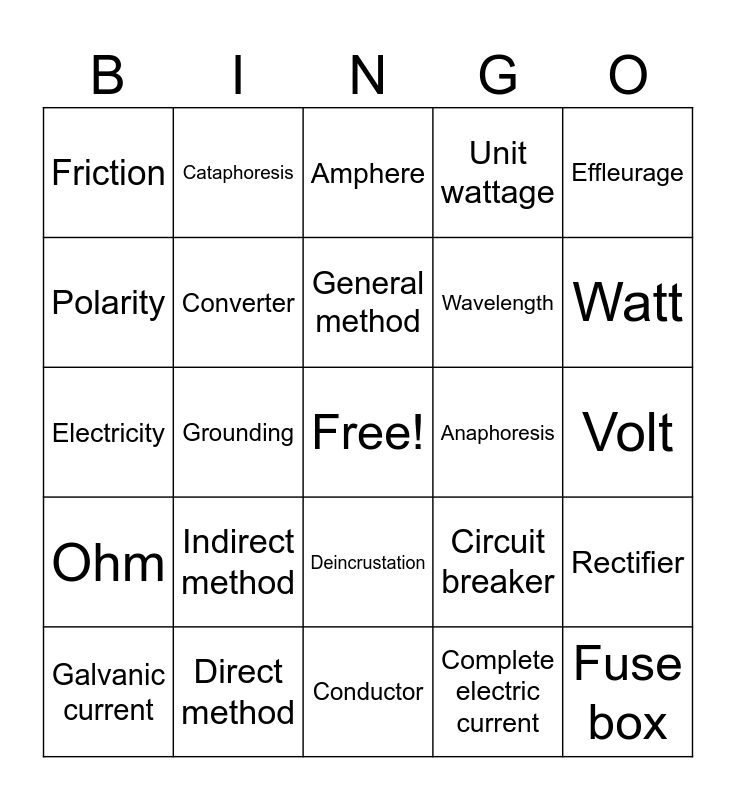 This bingo card has a free space and 24 words: Indirect method, Direct method, General method, Galvanic current, Effleurage, Friction, Polarity, Cataphoresis, Anaphoresis, Deincrustation, Wavelength, Electricity, Circuit breaker, Rectifier, Converter, Complete electric current, Volt, Amphere, Watt, Grounding, Fuse box, Ohm, Unit wattage and Conductor.