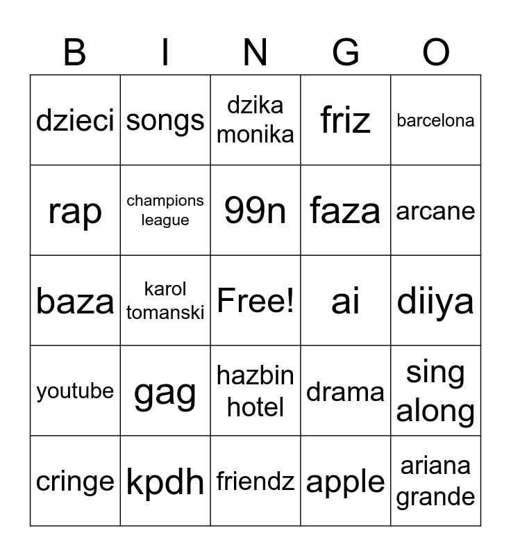 This bingo card has a free space and 24 words: gag, kpdh, 99n, cringe, barcelona, dzieci, rap, songs, ai, hazbin hotel, faza, baza, drama, sing along, champions league, apple, diiya, dzika monika, arcane, karol tomanski, ariana grande, youtube, friz and friendz.