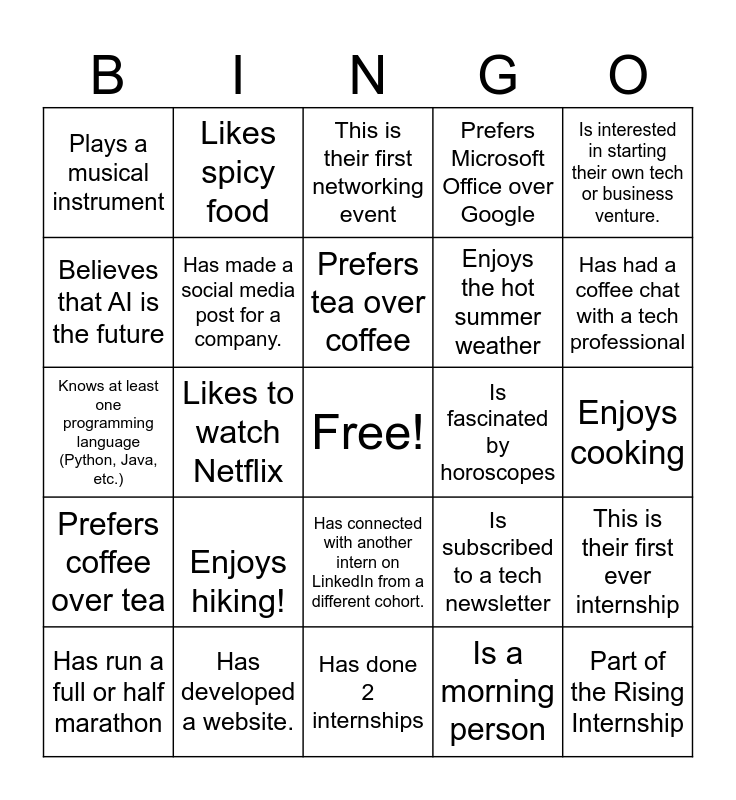 This bingo card has a free space and 24 words: Enjoys hiking!, Has developed a website., Prefers tea over coffee, Has run a full or half marathon, Is interested in starting their own tech or business venture., Plays a musical instrument, Believes that AI is the future, Likes spicy food, Is fascinated by horoscopes, Has connected with another intern on LinkedIn from a different cohort., Enjoys the hot summer weather, Knows at least one programming language (Python, Java, etc.), Is subscribed to a tech newsletter, This is their first ever internship, Has made a social media post for a company., Is a morning person, Enjoys cooking, This is their first networking event, Has had a coffee chat with a tech professional, Likes to watch Netflix, Part of the Rising Internship, Prefers coffee over tea, Prefers Microsoft Office over Google and Has done 2 internships.