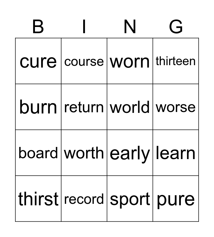 This bingo card has 20 words: learn, dirty, worn, sore, thirst, burn, record, cure, board, course, worth, early, return, pure, world, search, worse, thirteen, sport and current.
