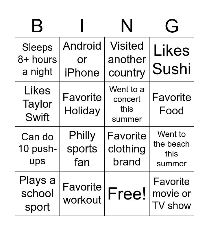 This bingo card has 17 words: Free!, Plays a school sport, Visited another country, Sleeps 8+ hours a night, Philly sports fan, Likes Sushi, Went to the beach this summer, Went to a concert this summer, Favorite Food, Favorite Holiday, Favorite workout, Favorite clothing brand, Likes Taylor Swift, Android or iPhone, Can do 10 push-ups, Favorite song and Favorite movie or TV show.