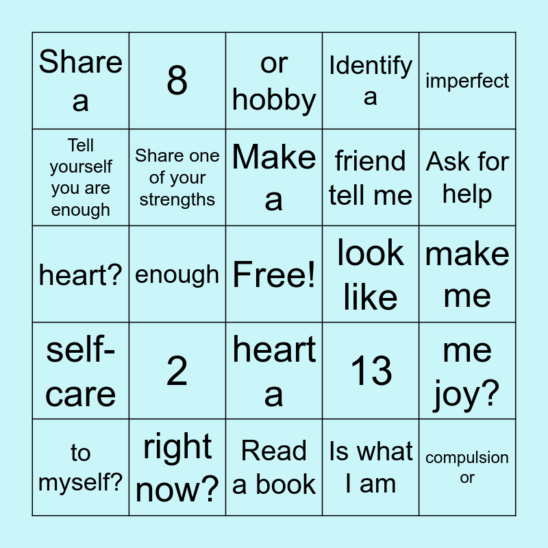 This bingo card has a free space and 180 words: Set a goal, Share a coping skill, Take a deep breath, Forgive yourself, Share one of your strengths, Identify a new skill or hobby to try, Read something inspirational, Give yourself a compliment, Share your favorite coping skill, Ask for help, Remember to reward yourself, Forgive someone, Ask for help, Be kind to yourself, Tell yourself you are enough, Think of a new coping skill to try, Read a book, Don't be afraid to have big goals, Express your feelings, Think of something you are proud of, Create a happy playlist, Share your favorite coping skill, Help someone, Check in with your feelings, One thing, I can do, when I am, anxous?, 2, Something, I am, grateful, for?, 3, Read, a book, 4, Free!, 5, Name, something, you do for, self-care, 6, What, make me, feel safe?, 7, What is a, good reason, to put a hand, on your, heart?, 8, What do, I need, more of?, 9, What does, Anxiety, look like, for me?, 10, What, made me, smile this, week?, 11, Share your, favorite, coping skill, 12, Give the, person next, to you a, compliment., 13, How can I, show, myself, gentleness?, 14, Name a, support, person in, your life., 15, Share your, favorite, coping skill, 16, Make a, funny, face?, 17, Give, yourself a, compliment, 18, Is what I am, thinking, helping or, hurting me?, 19, Tell, yourself, you are, enough, 20, What, am I, feeling?, 21, Think of a, new, coping, skill to try, 22, When is a, hand on your, heart a, compulsion or, avoidance?, 23, Share a, coping, skill, 24, What would, my best, friend tell me, right now?, 25, Think of, something, you are, proud of, 26, What, brings, me joy?, 27, What do I, need less, of right, now?, 28, What is, one way I, can be kind, to myself?, 29, Identify a, new skill, or hobby, to try, 30, What, could I let, go of right, now?, 31, What, song, makes me, happy?, 32, Share one, of your, strengths, 33, Can I allow, myself to be, imperfect, today with, love?, 34, What is, one of my and goals?.