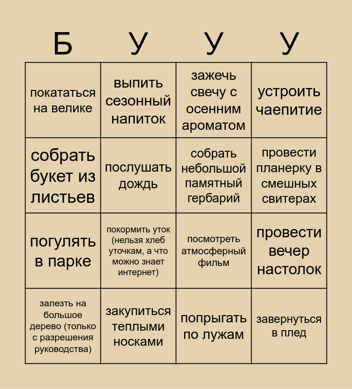 This bingo card has 16 words: закупиться теплыми носками, провести вечер настолок, зажечь свечу с осенним ароматом, покататься на велике, погулять в парке, выпить сезонный напиток, посмотреть атмосферный фильм, попрыгать по лужам, собрать букет из листьев, послушать дождь, залезть на большое дерево (только с разрешения руководства), устроить чаепитие, покормить уток (нельзя хлеб уточкам, а что можно знает интернет), провести планерку в смешных свитерах, собрать небольшой памятный гербарий and завернуться в плед.